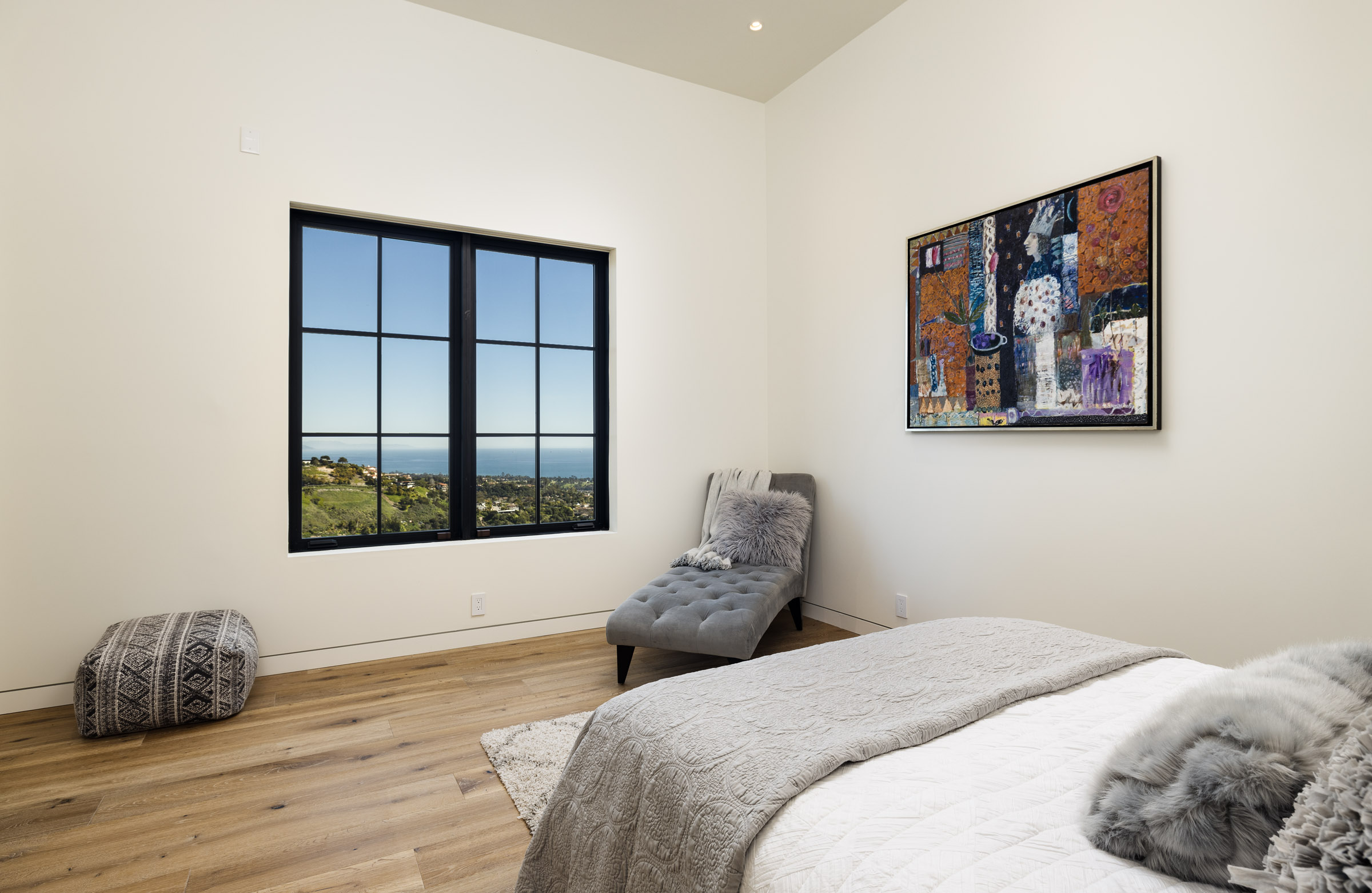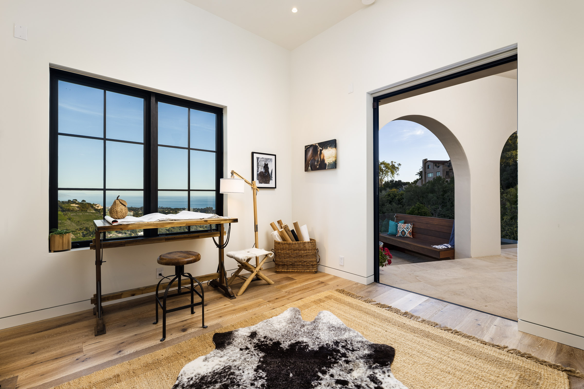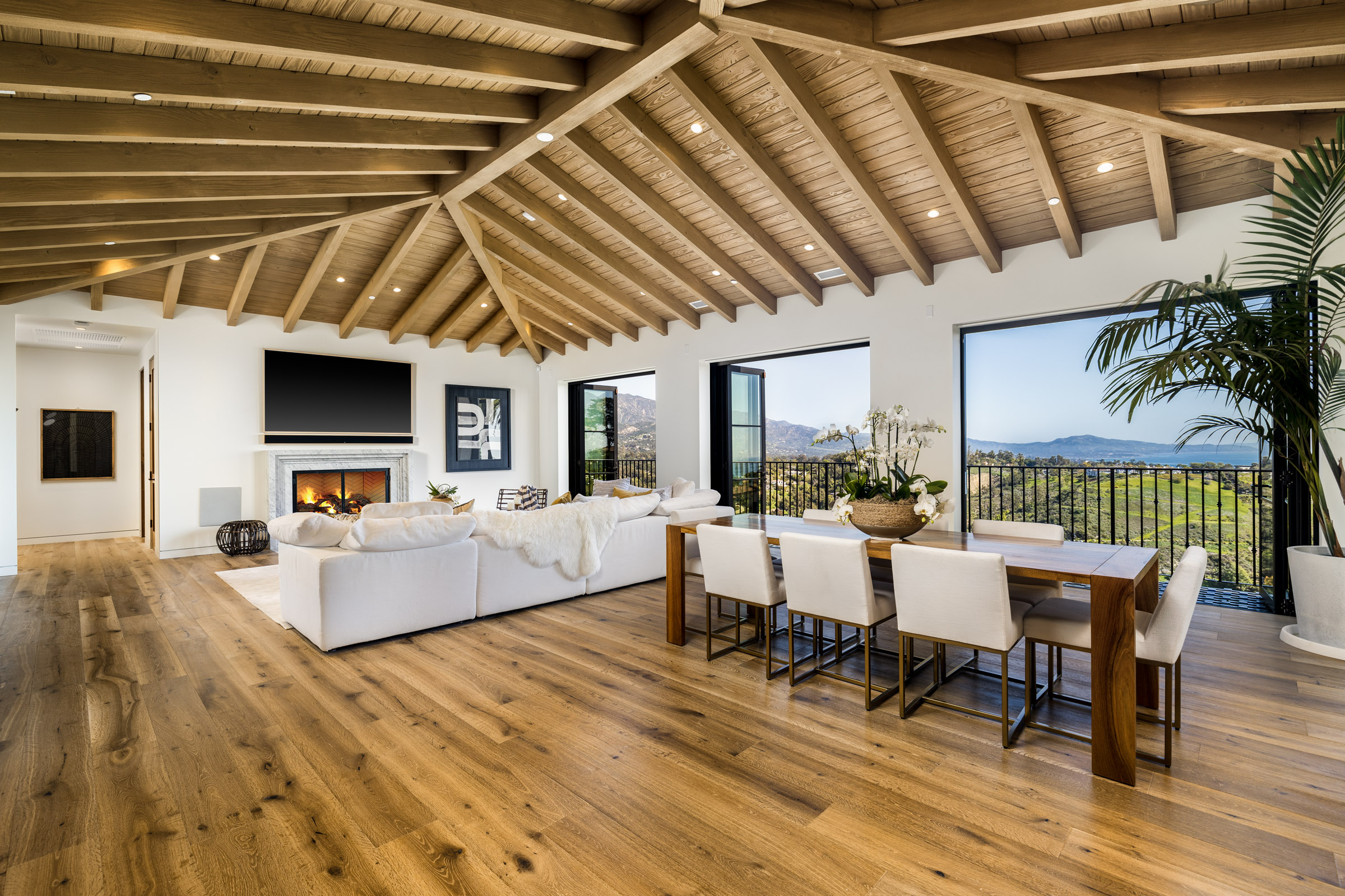 Where you’ll find spectacular 12 foot vaulted ceilings that create a sense of space further accentuated by the wall of French doors that open wide onto the balcony overlooking the canyon and coastline. From the windows, sneak a peak of the nearby mountains.