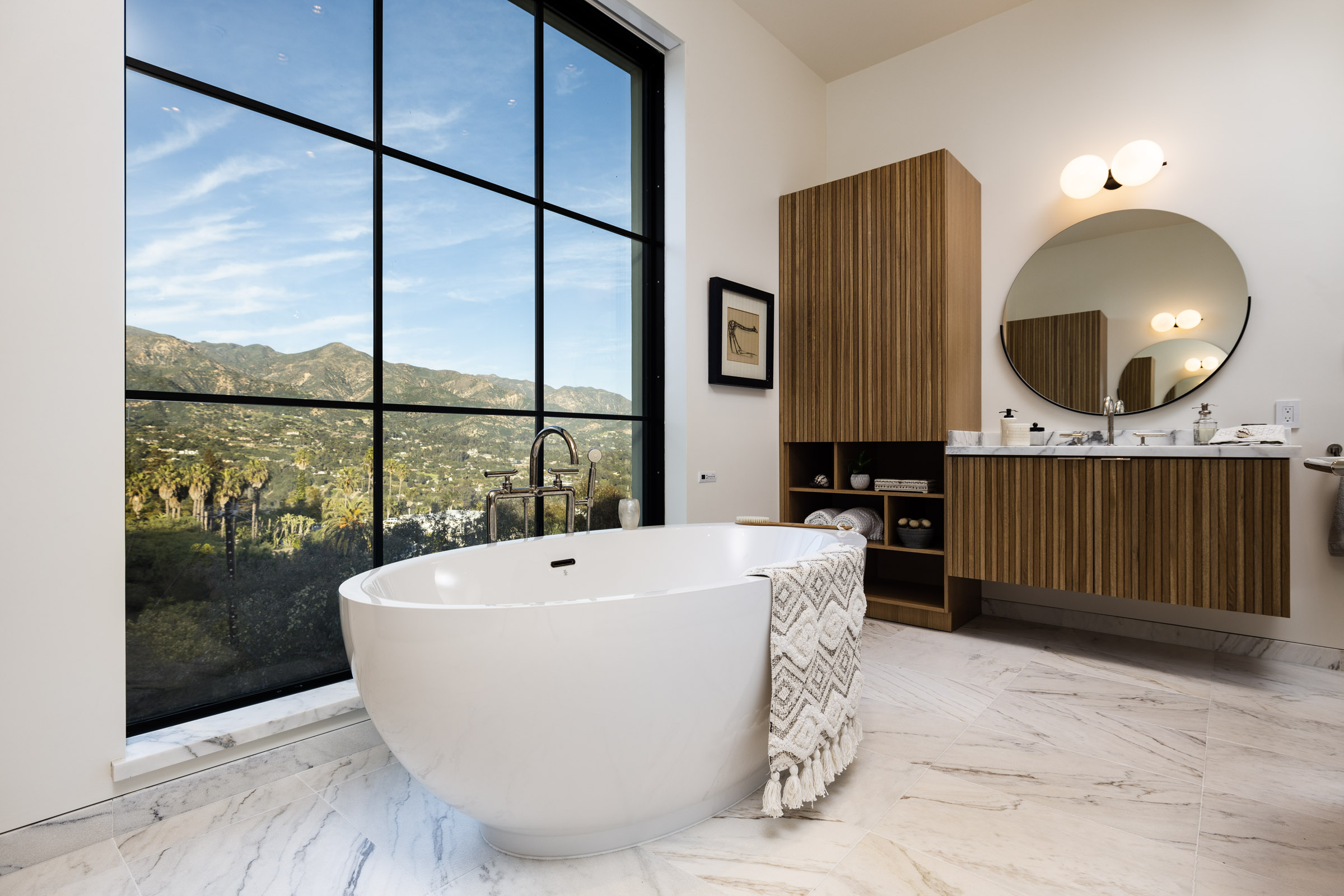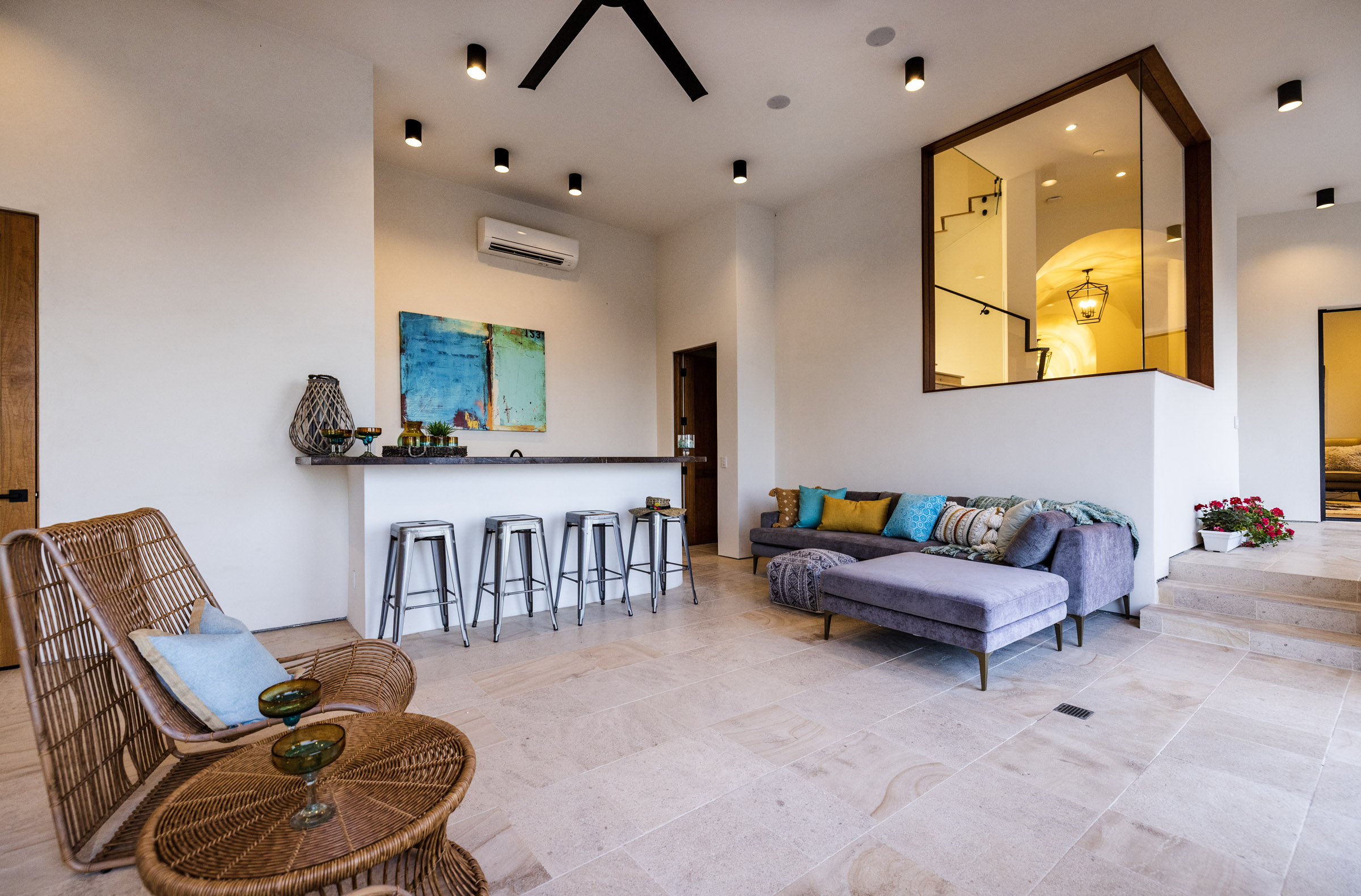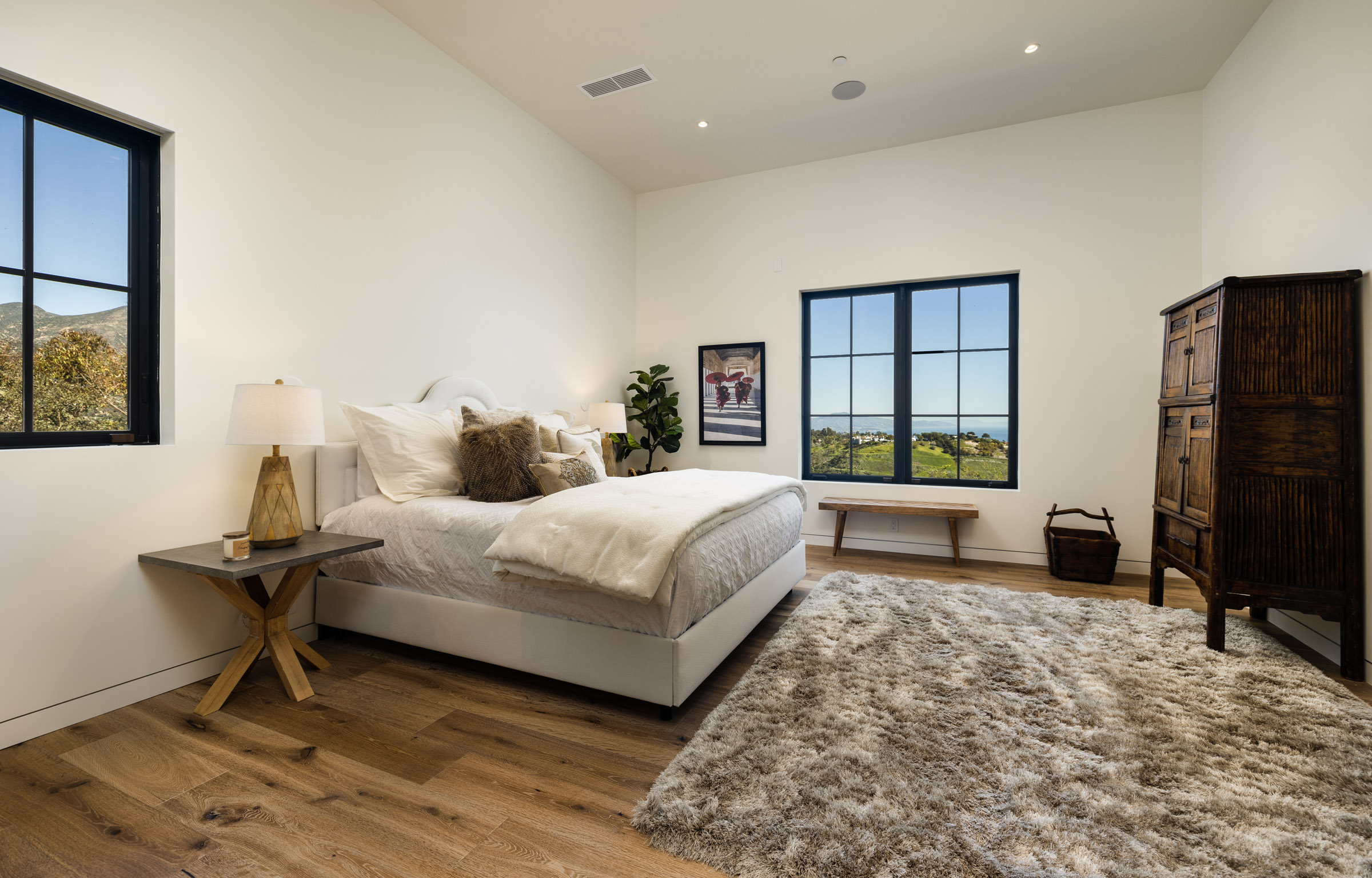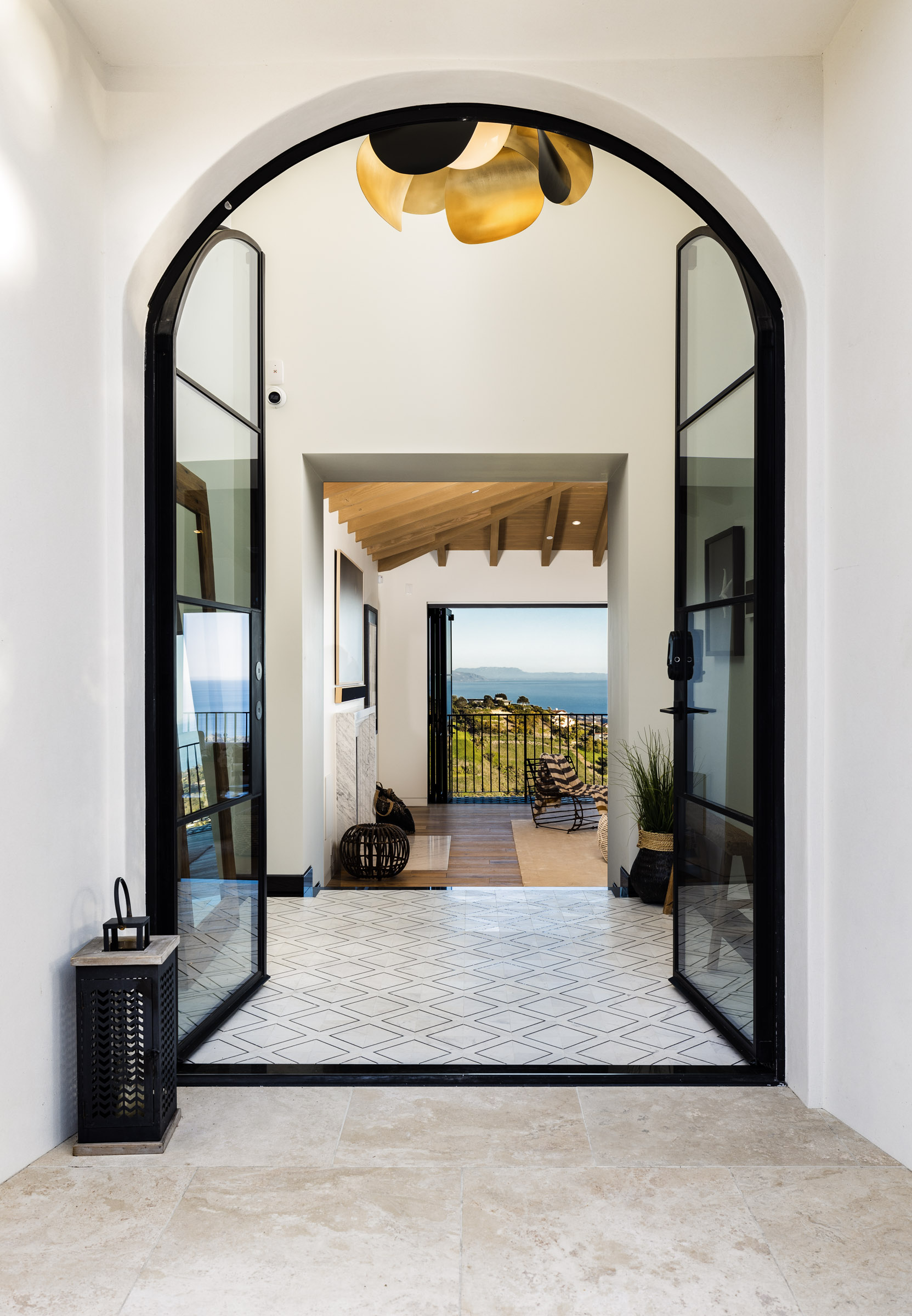 Where you’ll find spectacular 12 foot vaulted ceilings that create a sense of space further accentuated by the wall of French doors that open wide onto the balcony overlooking the canyon and coastline. From the windows, sneak a peak of the nearby mountains.