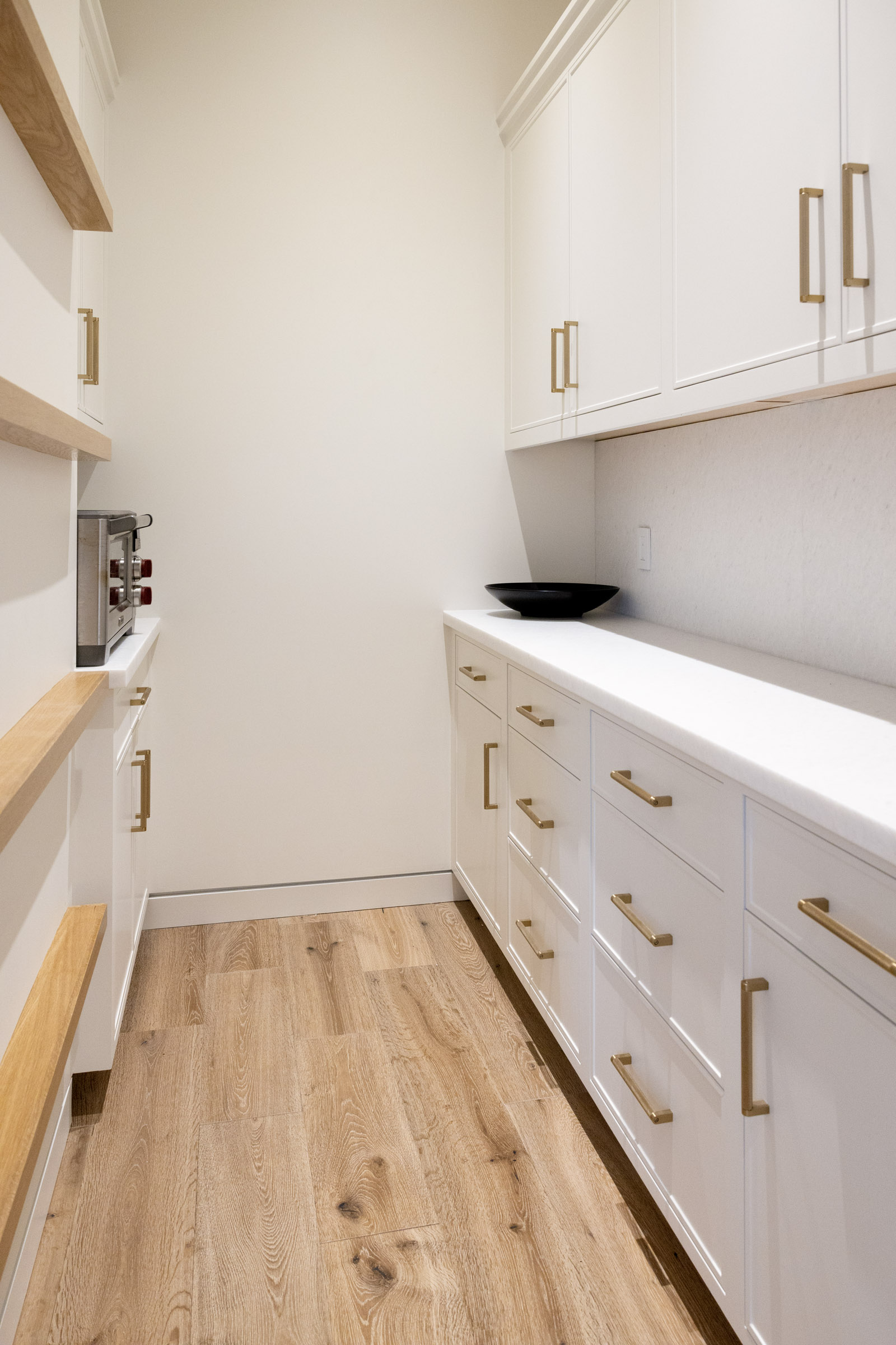 The dream kitchen comes complete with every high end appliance any chef could hope for: side by side 36” SubZero refrigerator and freezer with built in filtered water dispenser, a 6 burner Wolf double gas oven range, Miele UltraQuiet dishwasher, LG microwave drawer, abundant countertop and cabinet space as well as a walk in pantry.