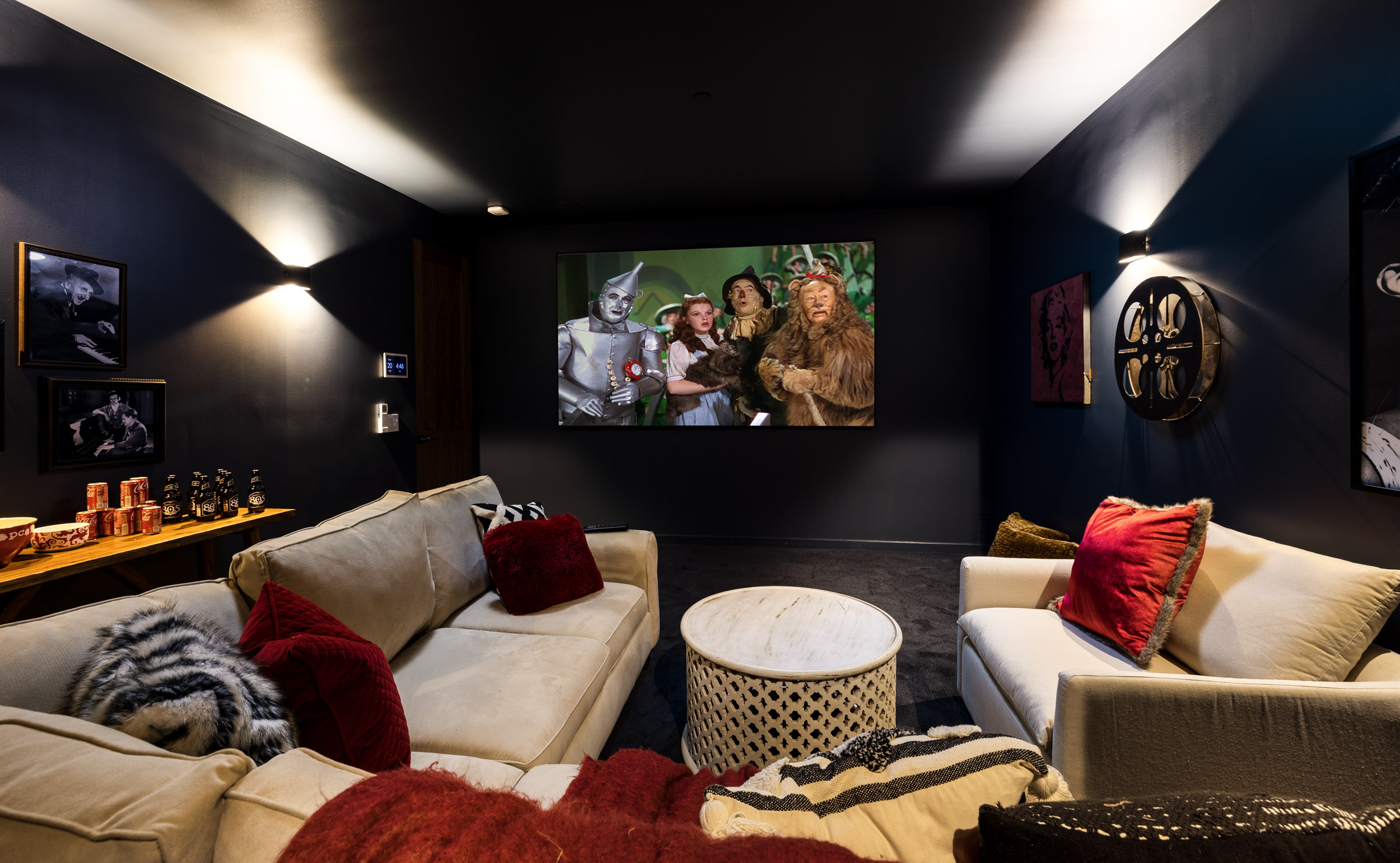 1000sf + of storage space is currently being used as a cozy home theater equipped with a 119″ movie screen, ceiling mounted movie projector and state-of-the-art technology, including surround sound and streaming capabilities.