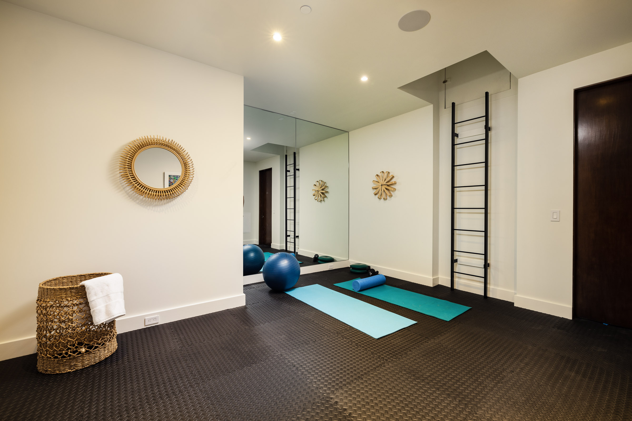 Storage space has also been converted into a home gym, complete with mirrored walls and fitness mat flooring which provides low impact support and comfort as you push through your routine.